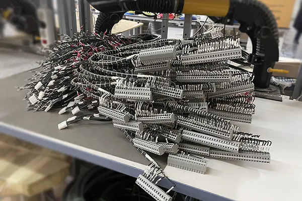 Нарезка проводов осуществляется как на автоматической линии нарезки провода, так и вручную. Нарезка на автоматической линии позволяет увеличить скорость производства исключая дополнительные операции по зачистке концов провода от изоляции, снижая себестоимость изделий, что очень ощутимо на больших партиях изделий.