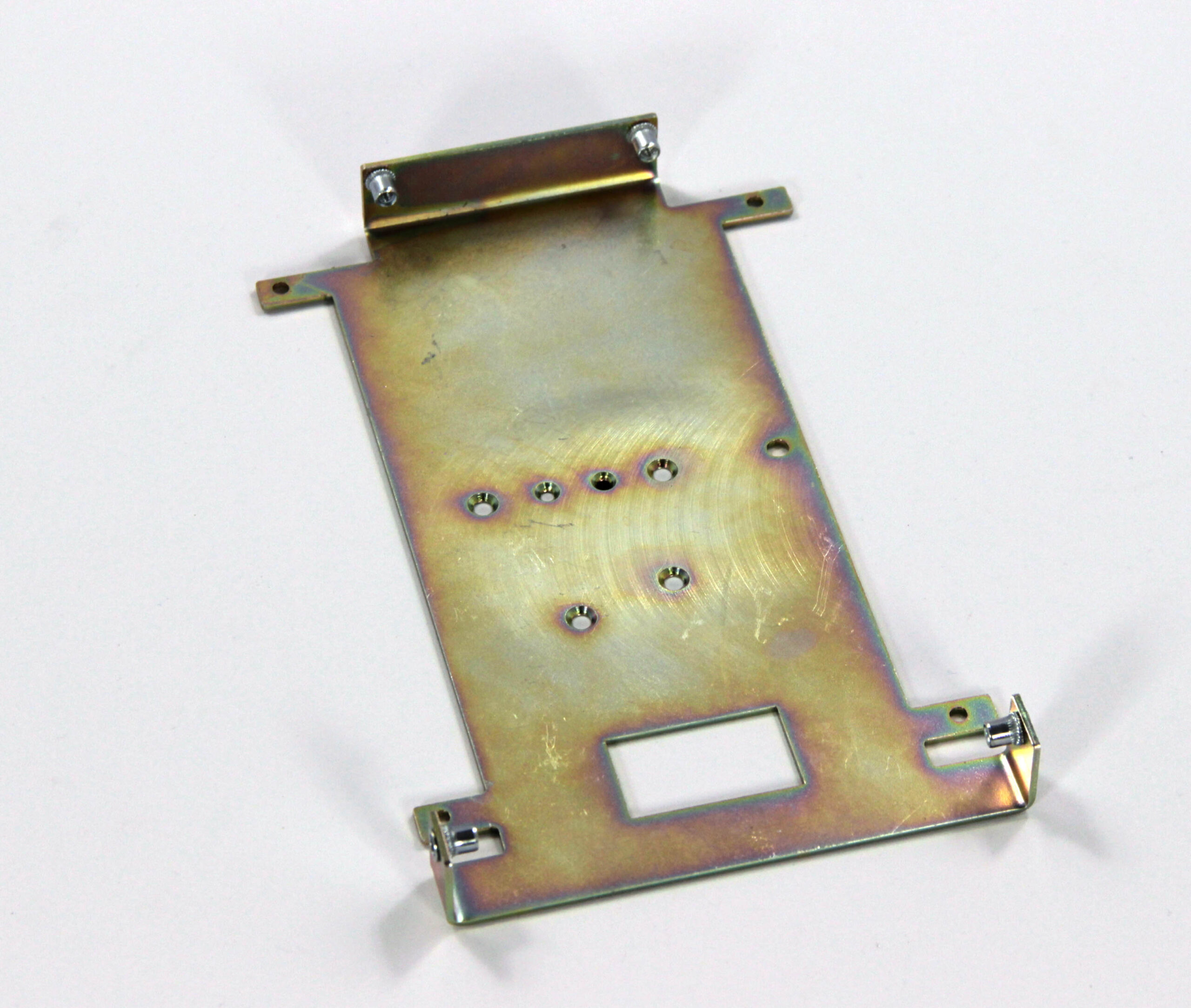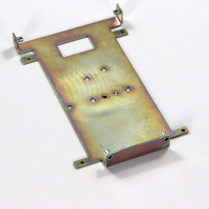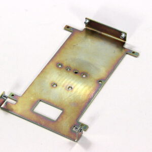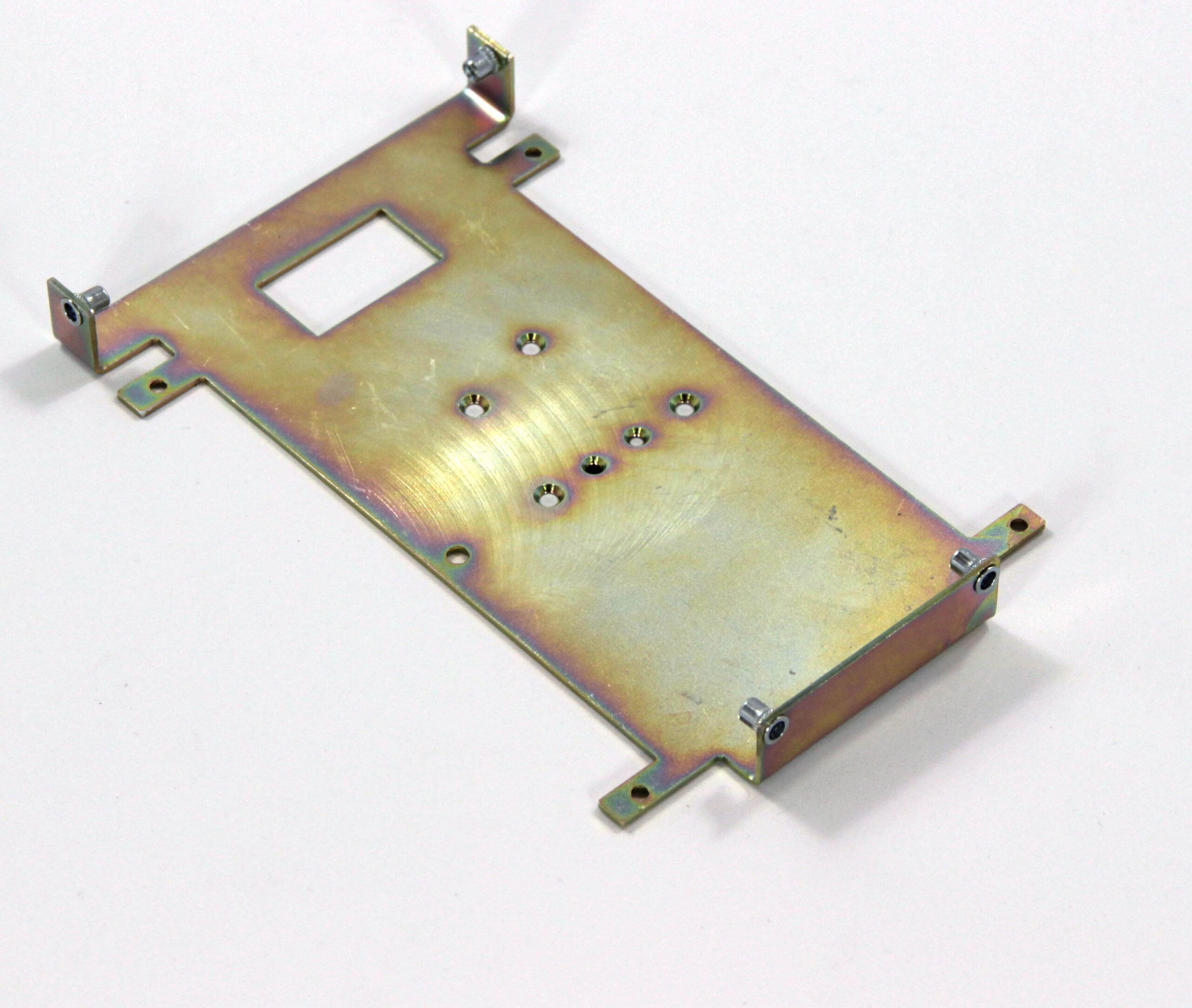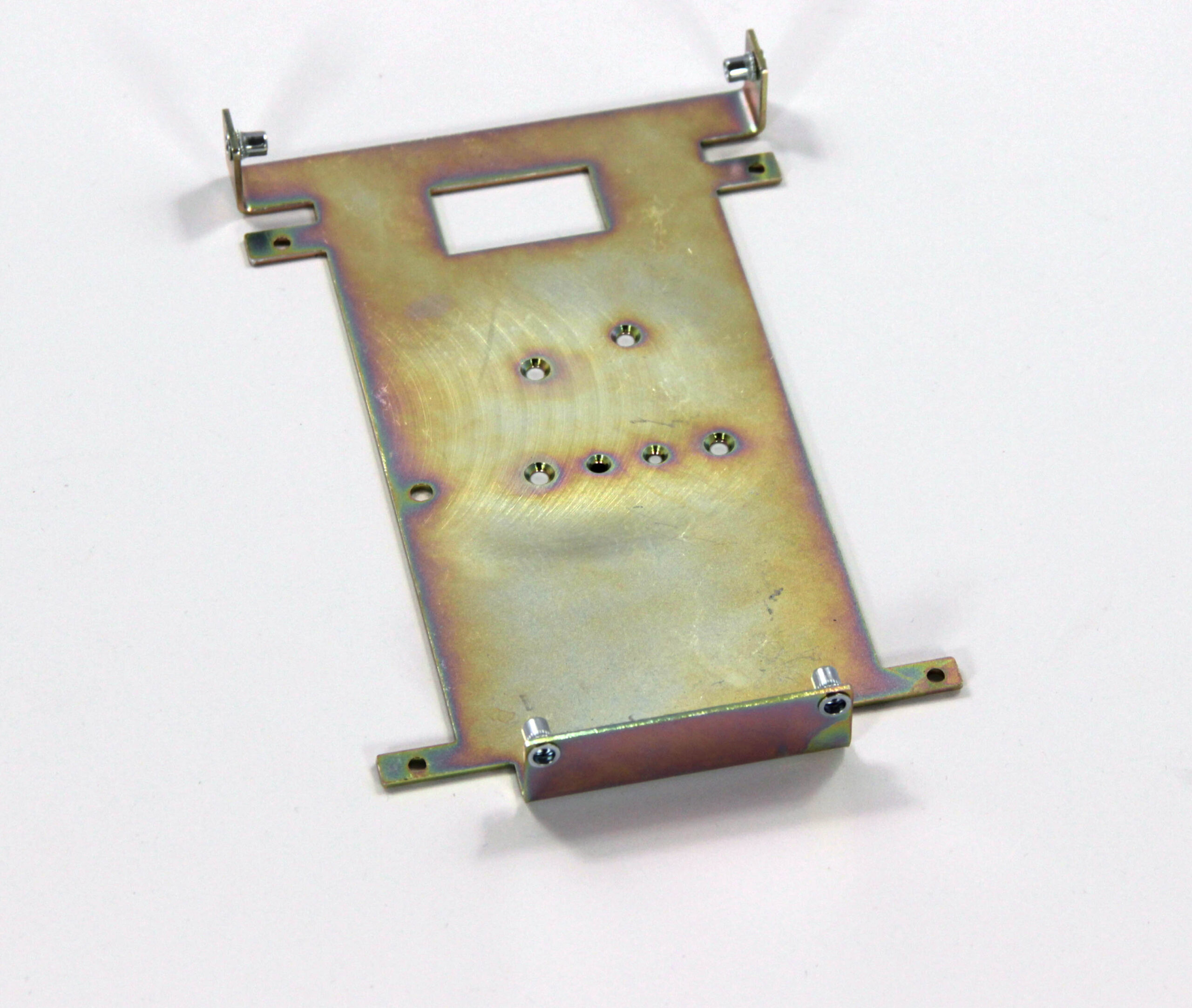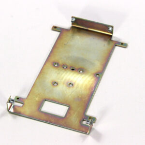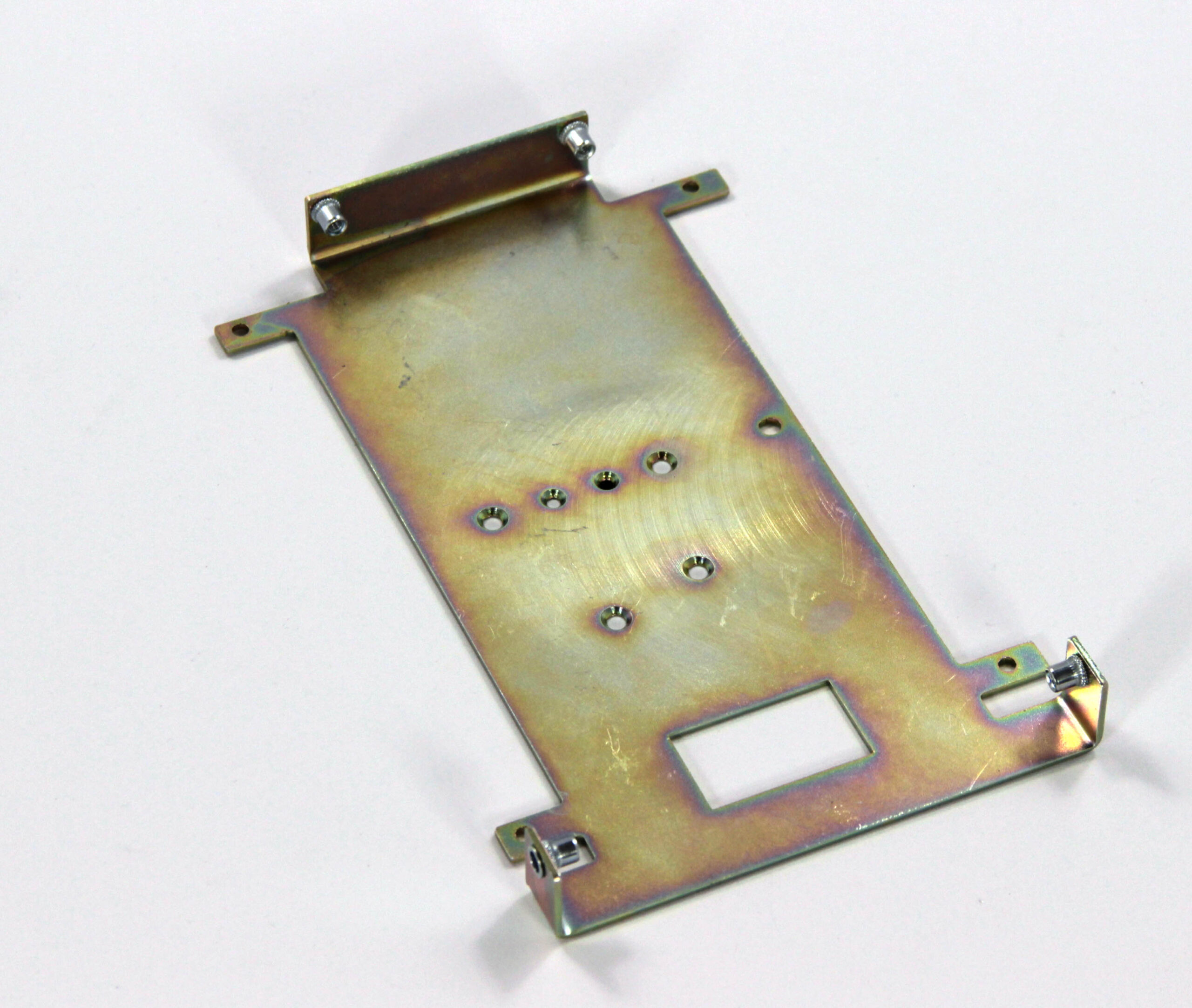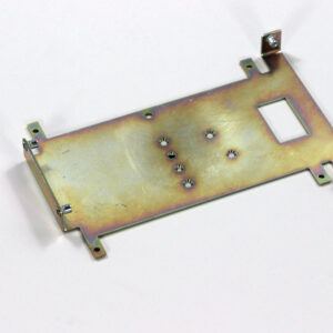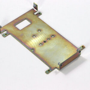 Конструкция включает центральную монтажную площадку с рядом отверстий Ø5 мм для крепления оборудования и два боковых крыла с гибкой под 90° для жёсткой фиксации на вертикальных поверхностях. Угловые вырезы и дополнительные отверстия обеспечивают точную посадку и вентиляцию, золотисто-коричневое покрытие придаёт повышенную устойчивость к внешним воздействиям.