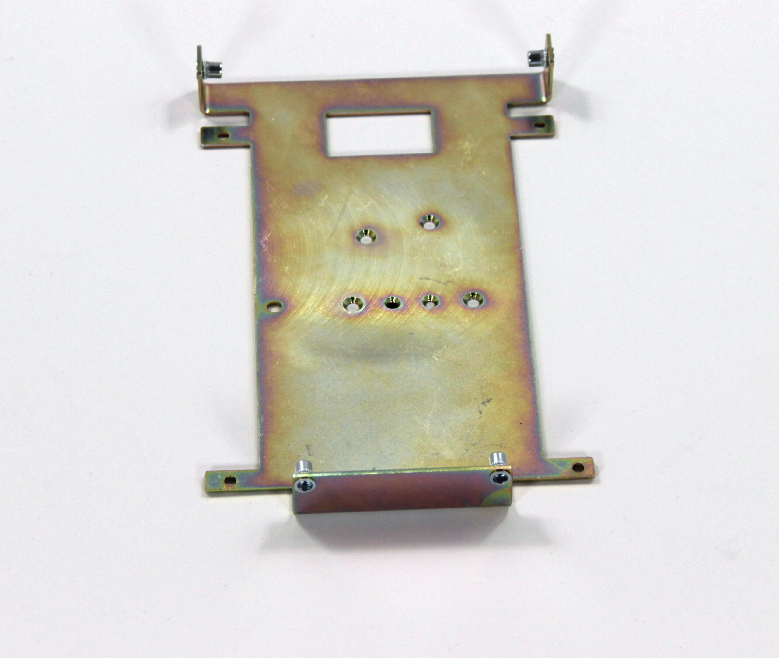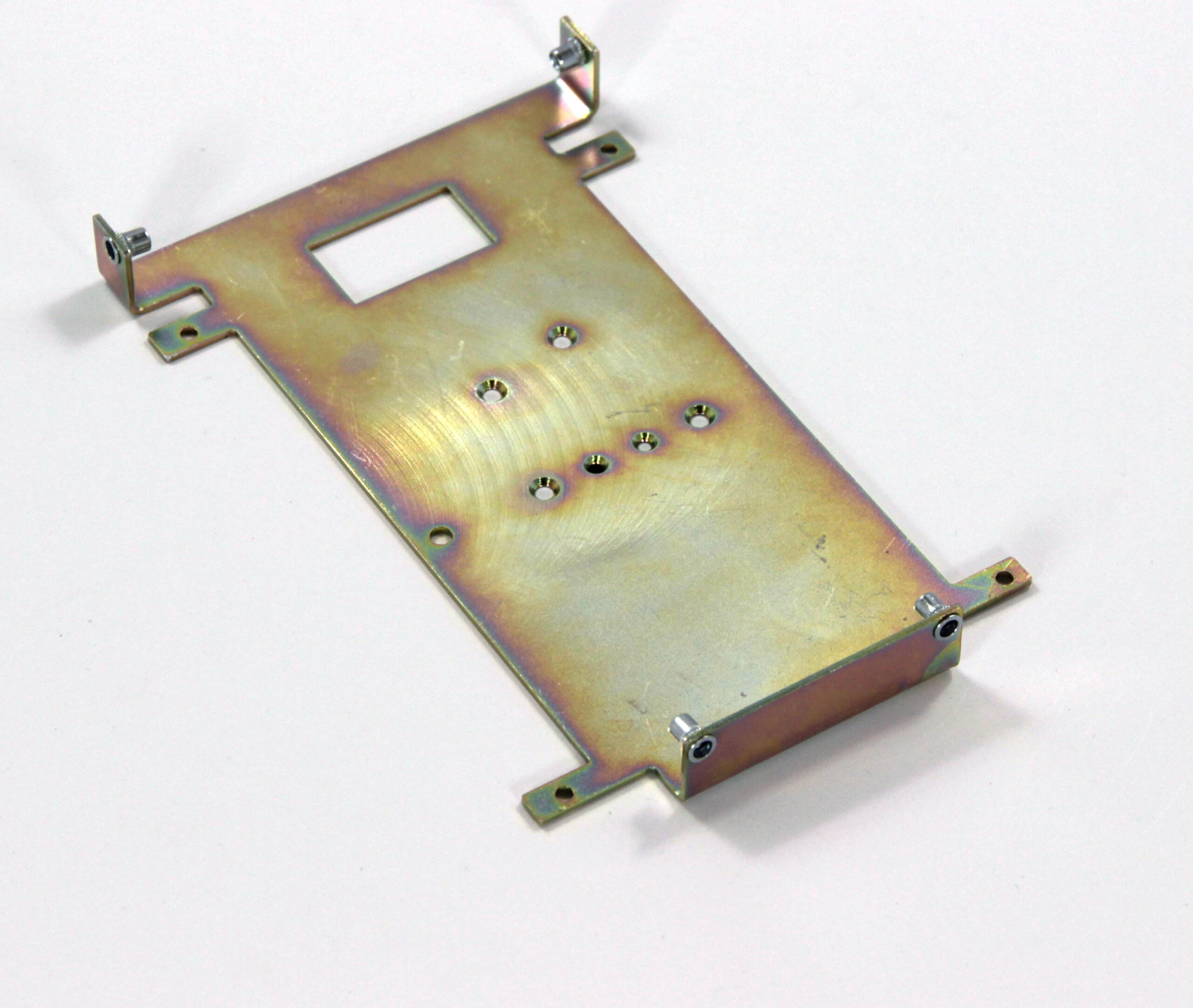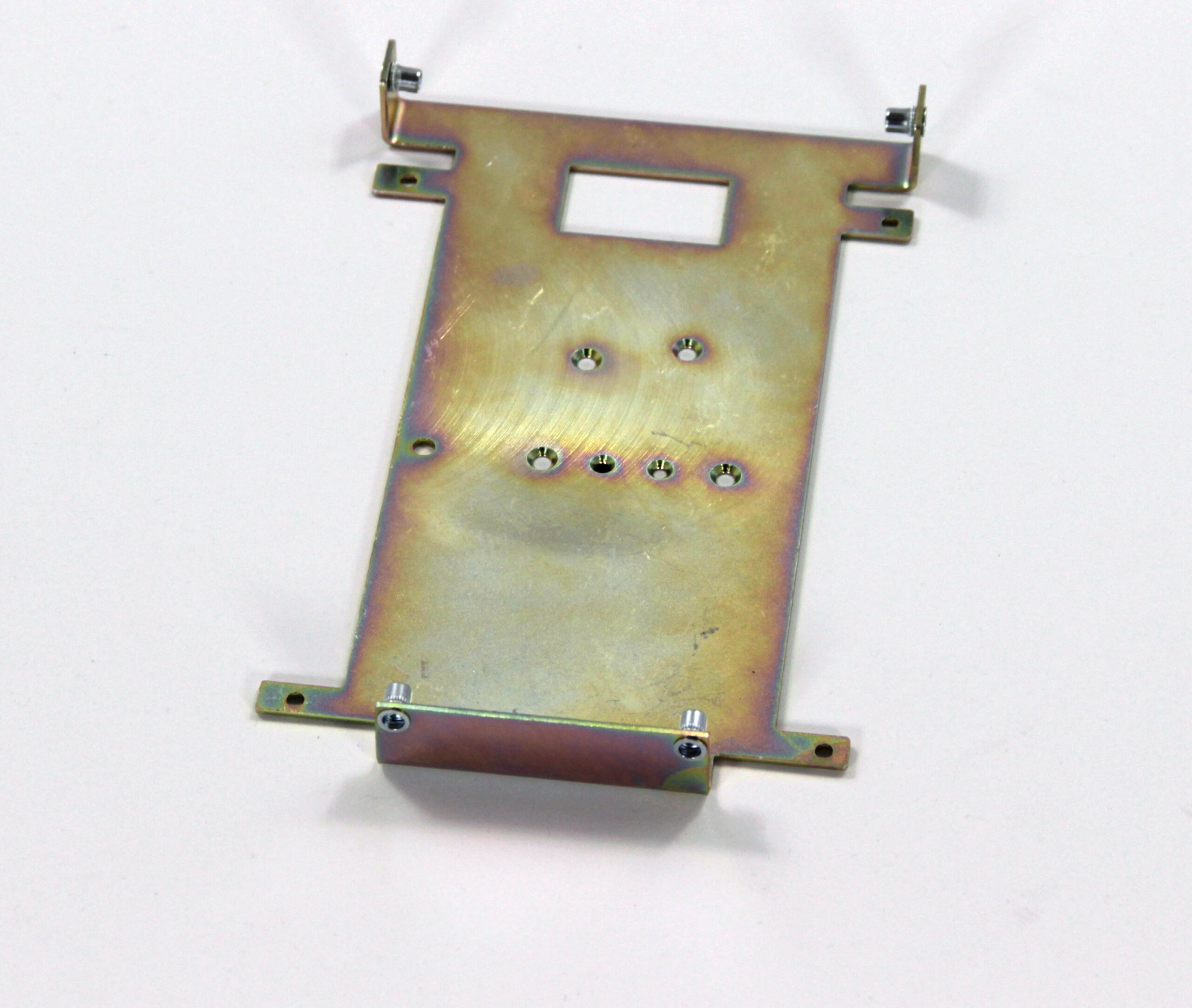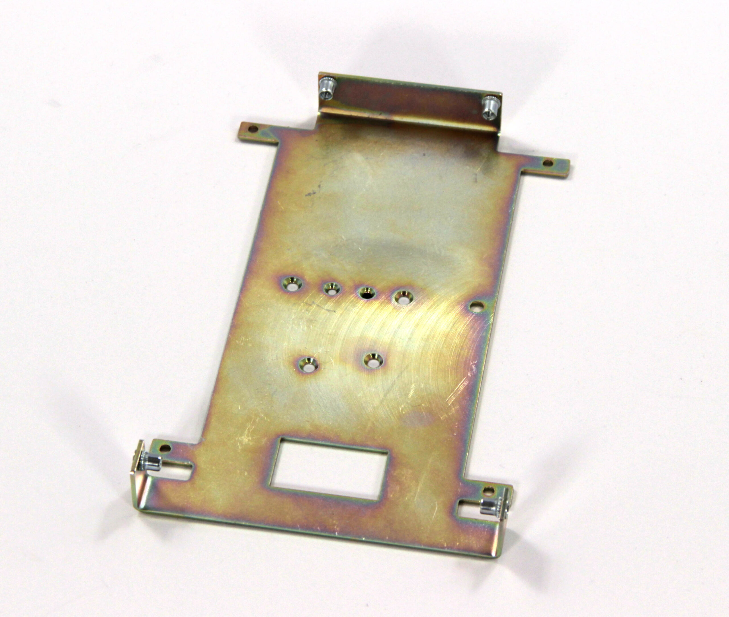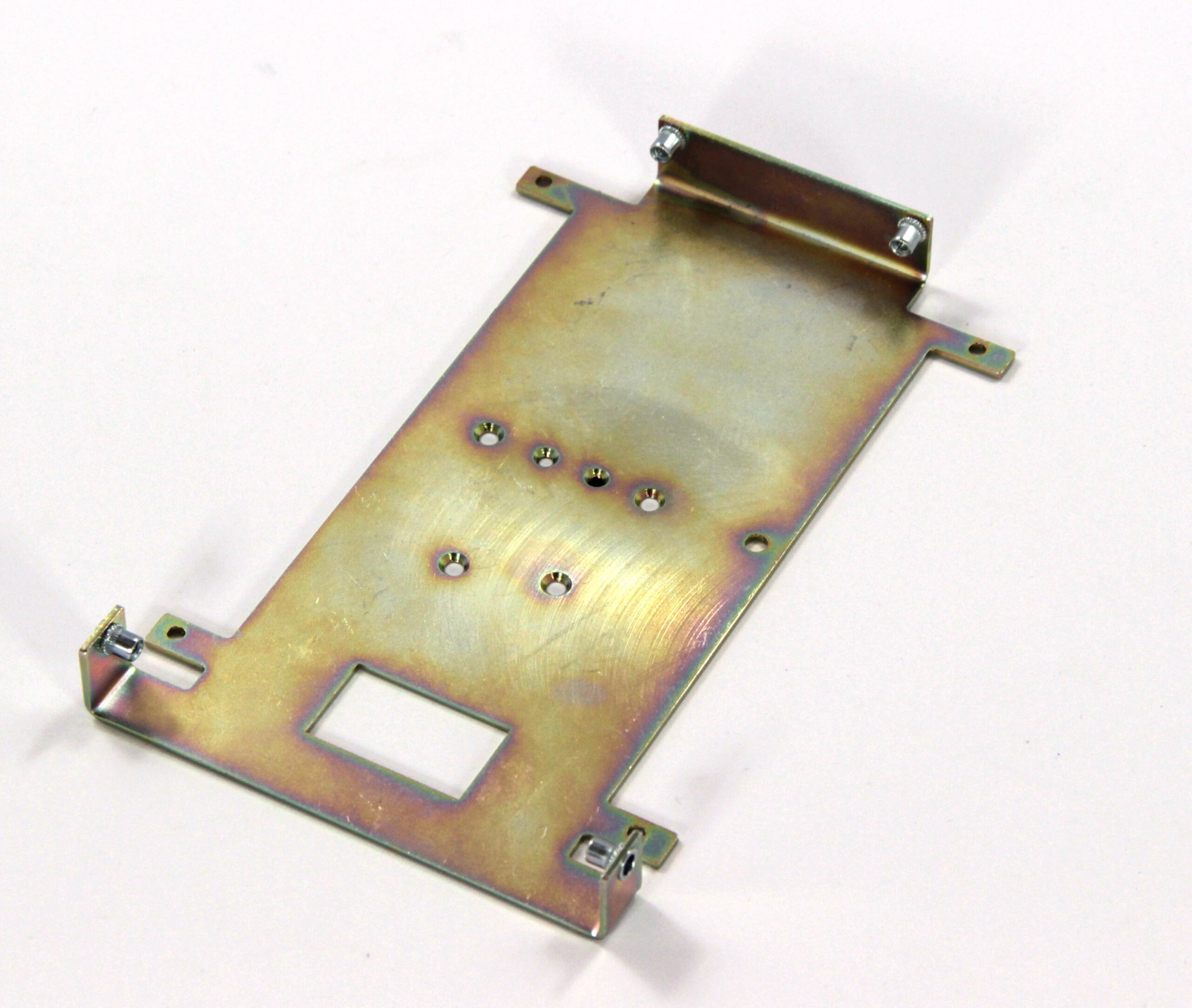 Конструкция включает центральную монтажную площадку с рядом отверстий Ø5 мм для крепления оборудования и два боковых крыла с гибкой под 90° для жёсткой фиксации на вертикальных поверхностях. Угловые вырезы и дополнительные отверстия обеспечивают точную посадку и вентиляцию, золотисто-коричневое покрытие придаёт повышенную устойчивость к внешним воздействиям.