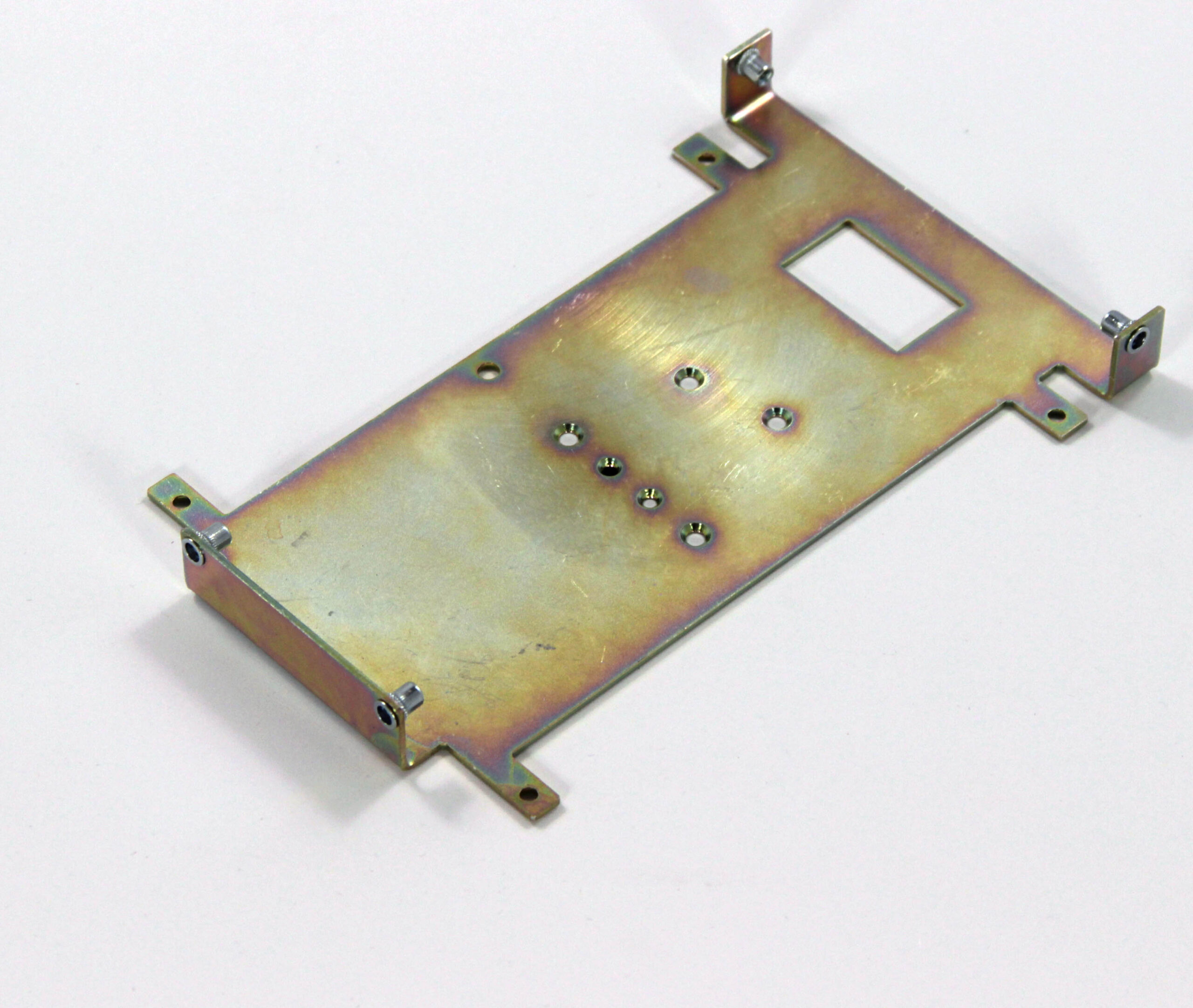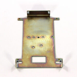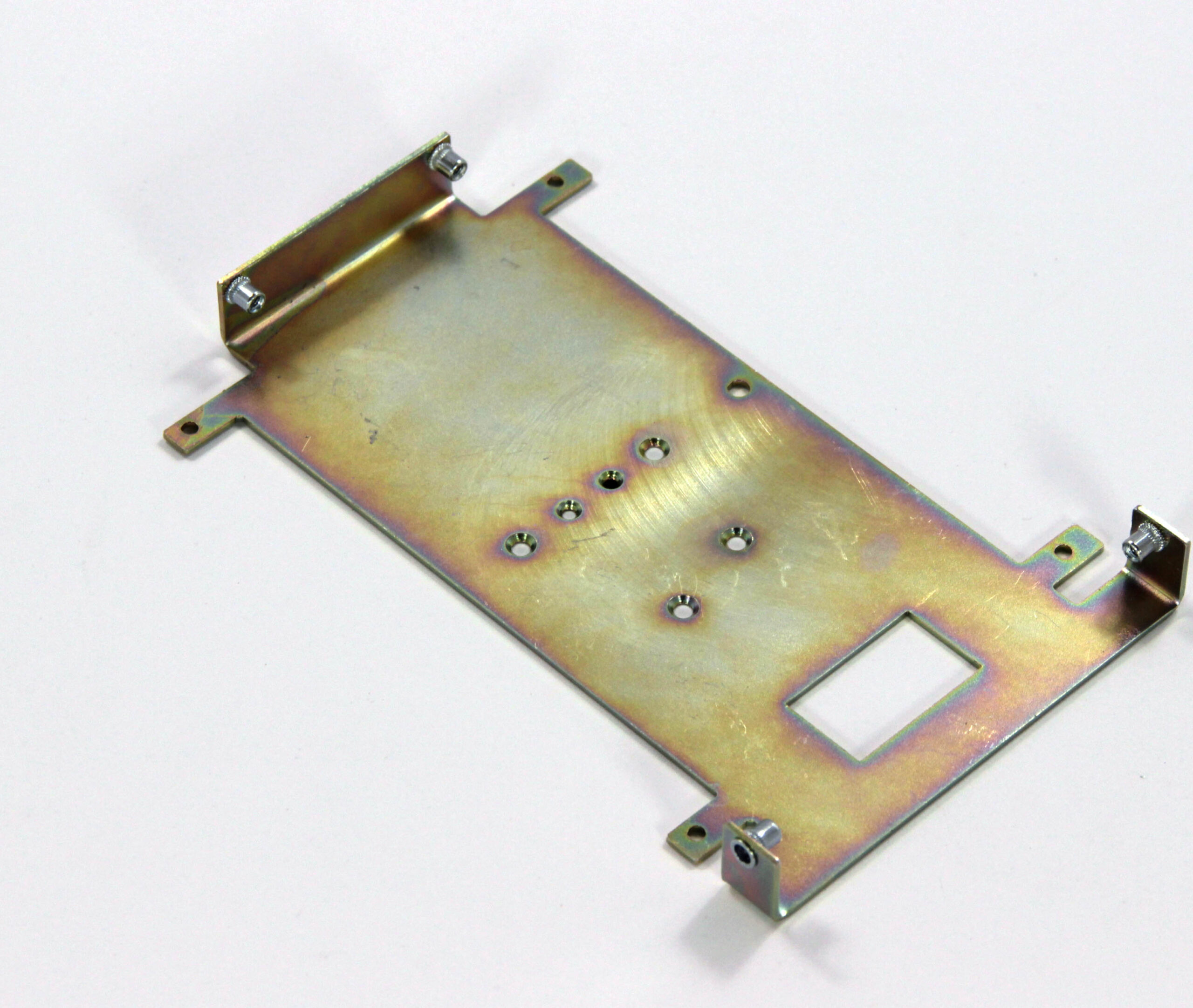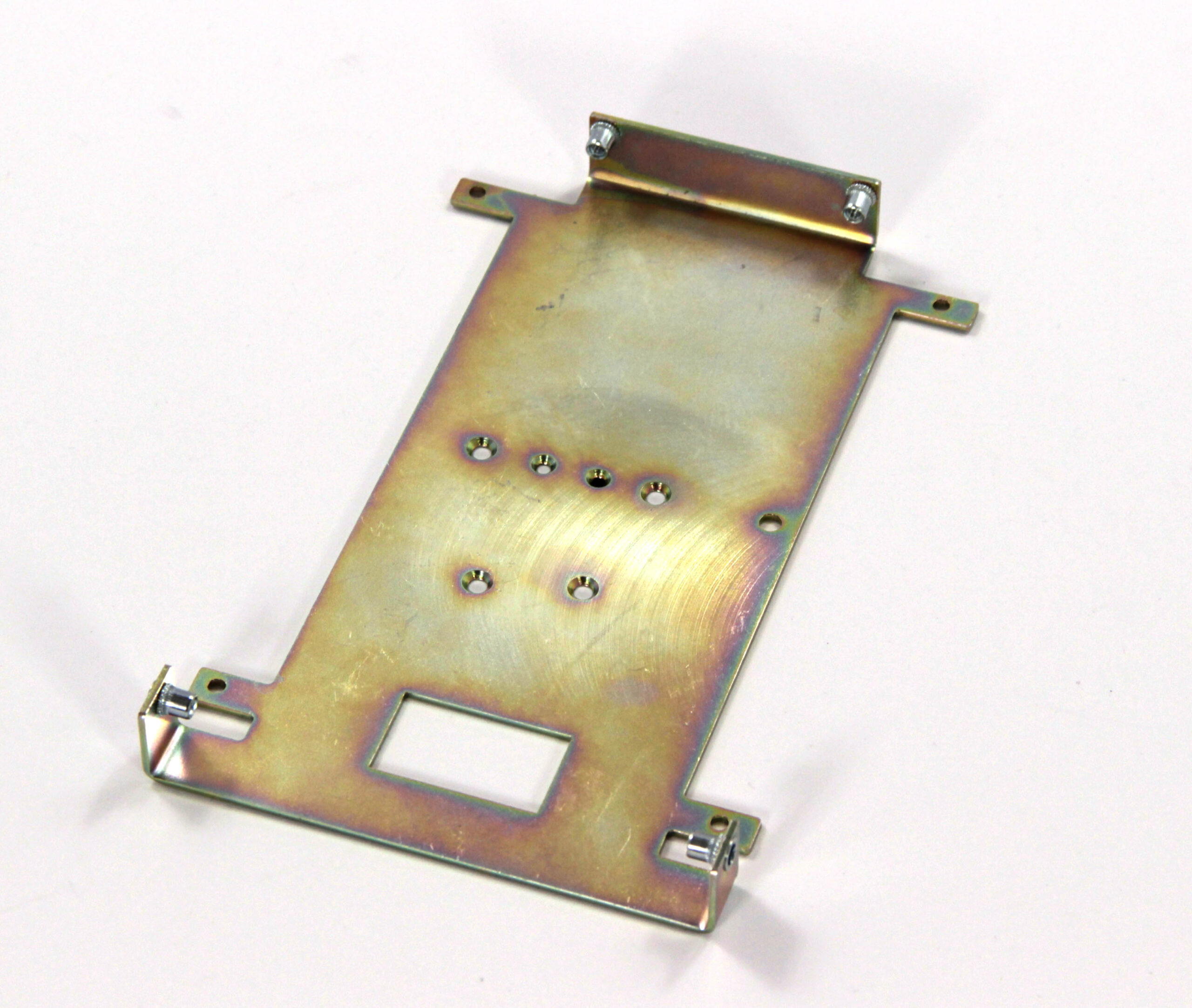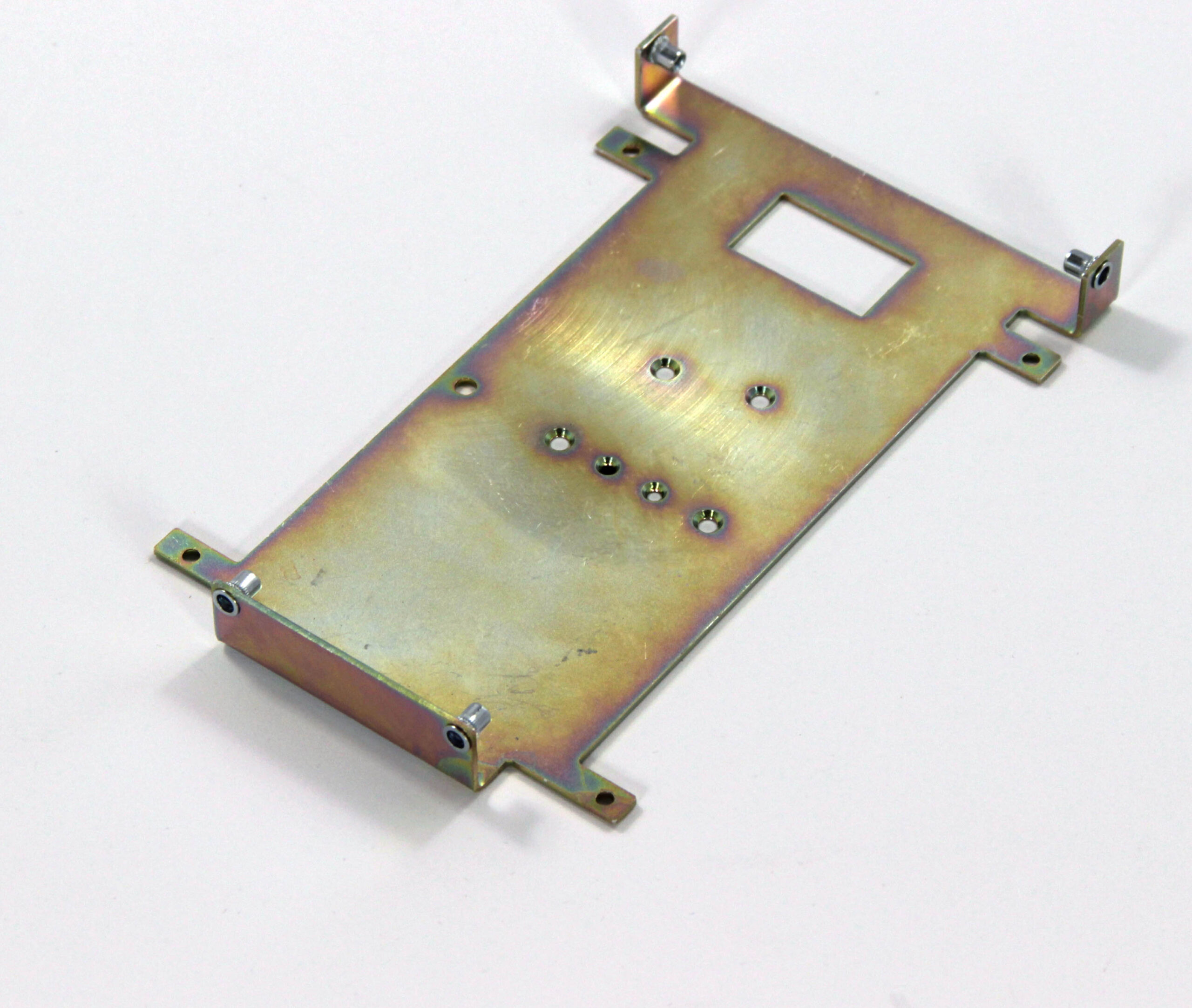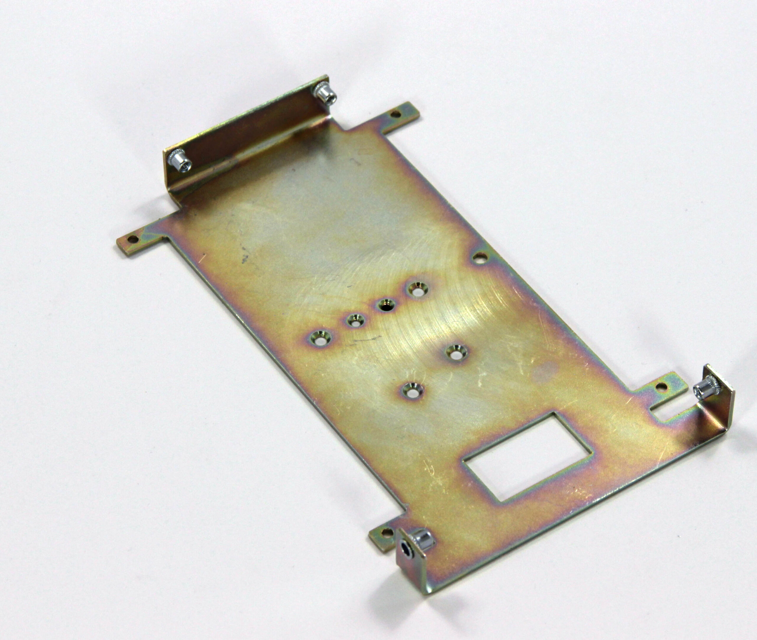 Конструкция включает центральную монтажную площадку с рядом отверстий Ø5 мм для крепления оборудования и два боковых крыла с гибкой под 90° для жёсткой фиксации на вертикальных поверхностях. Угловые вырезы и дополнительные отверстия обеспечивают точную посадку и вентиляцию, золотисто-коричневое покрытие придаёт повышенную устойчивость к внешним воздействиям.