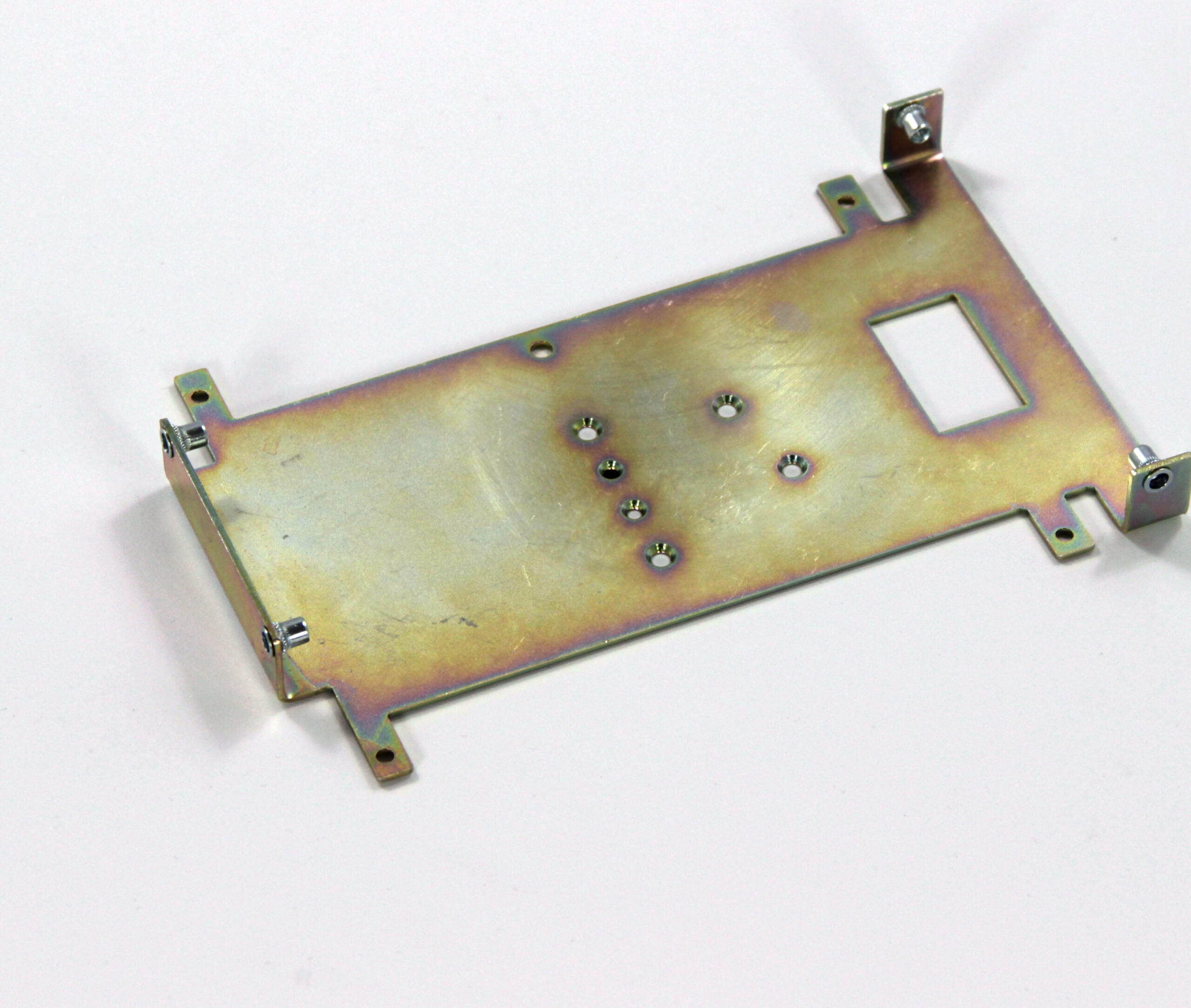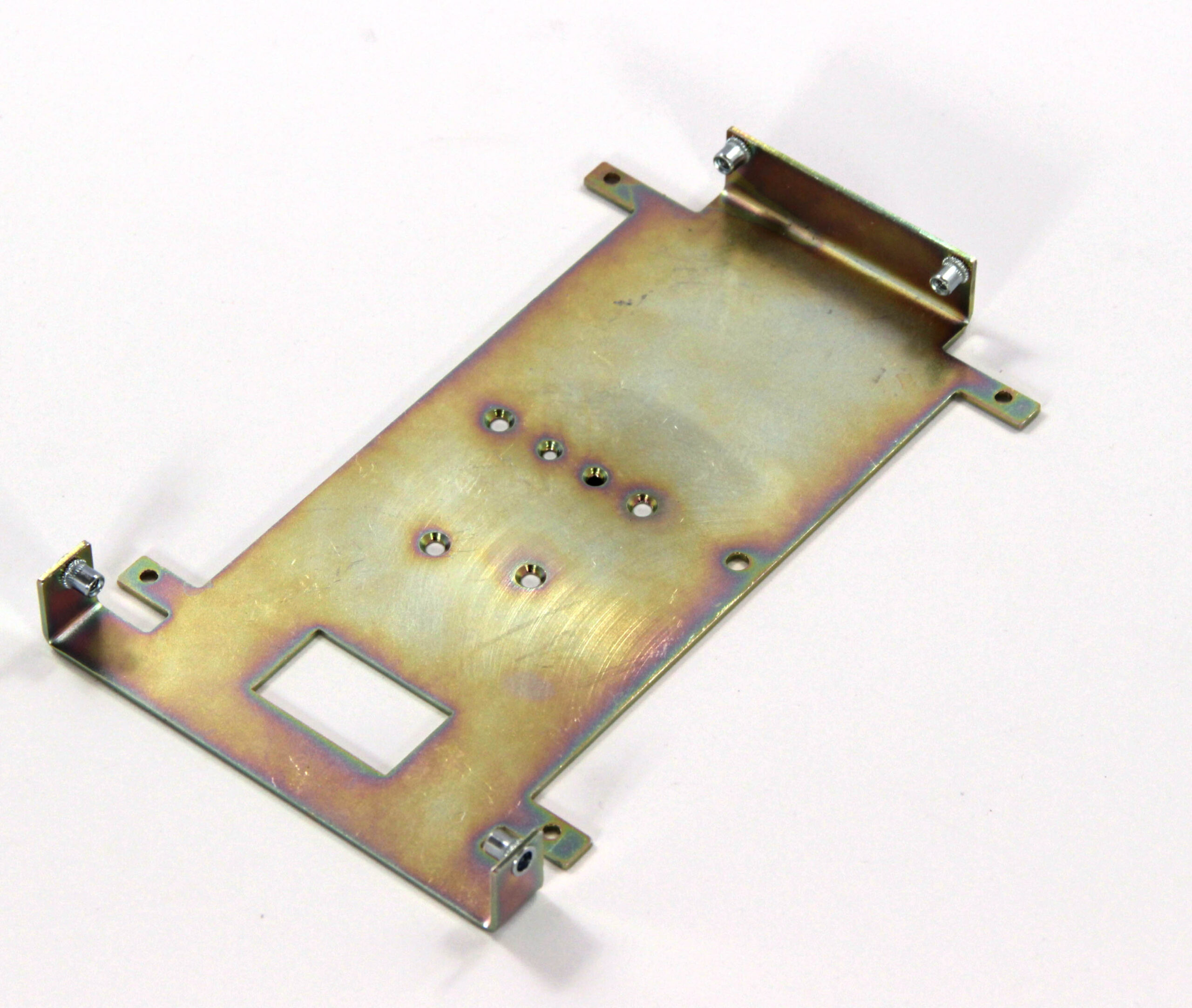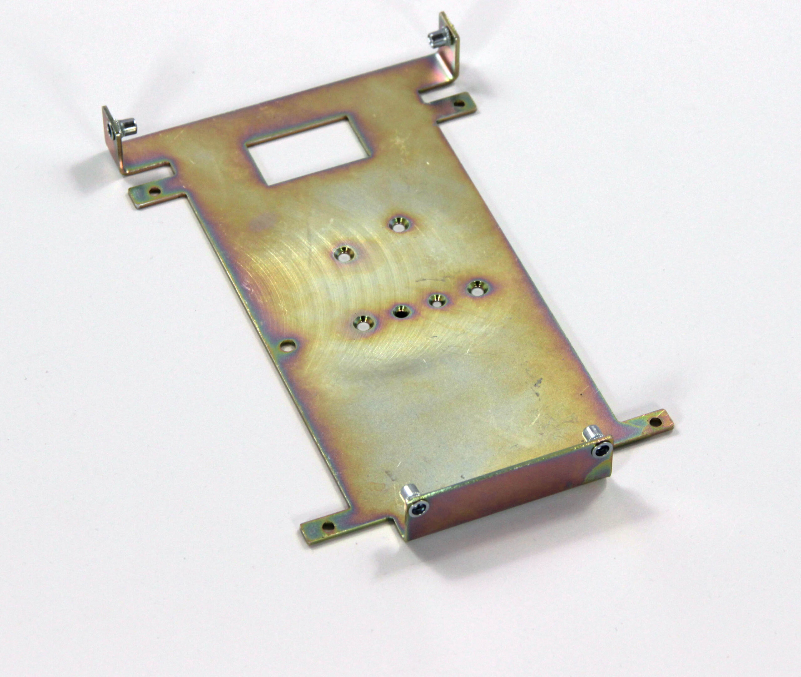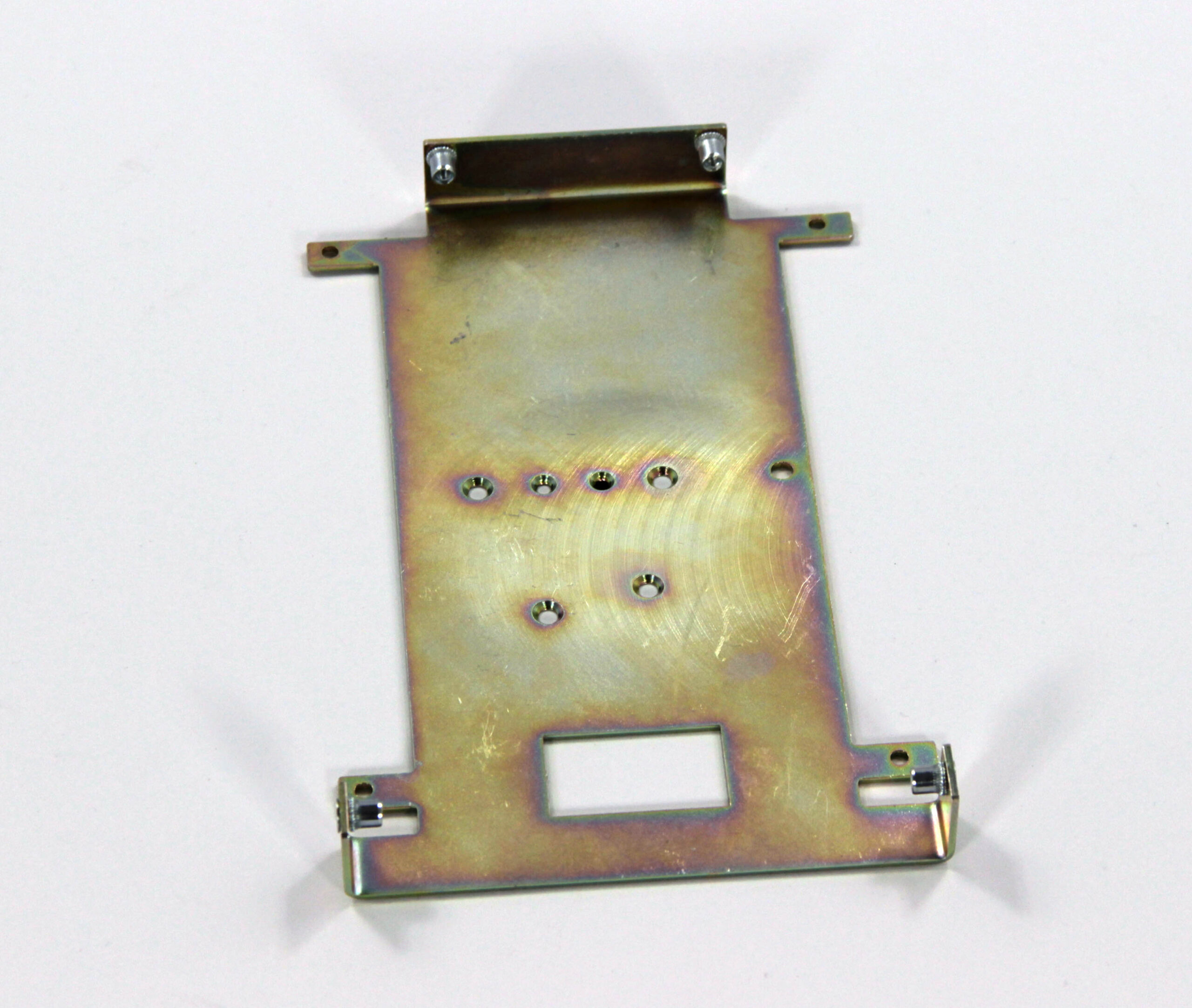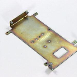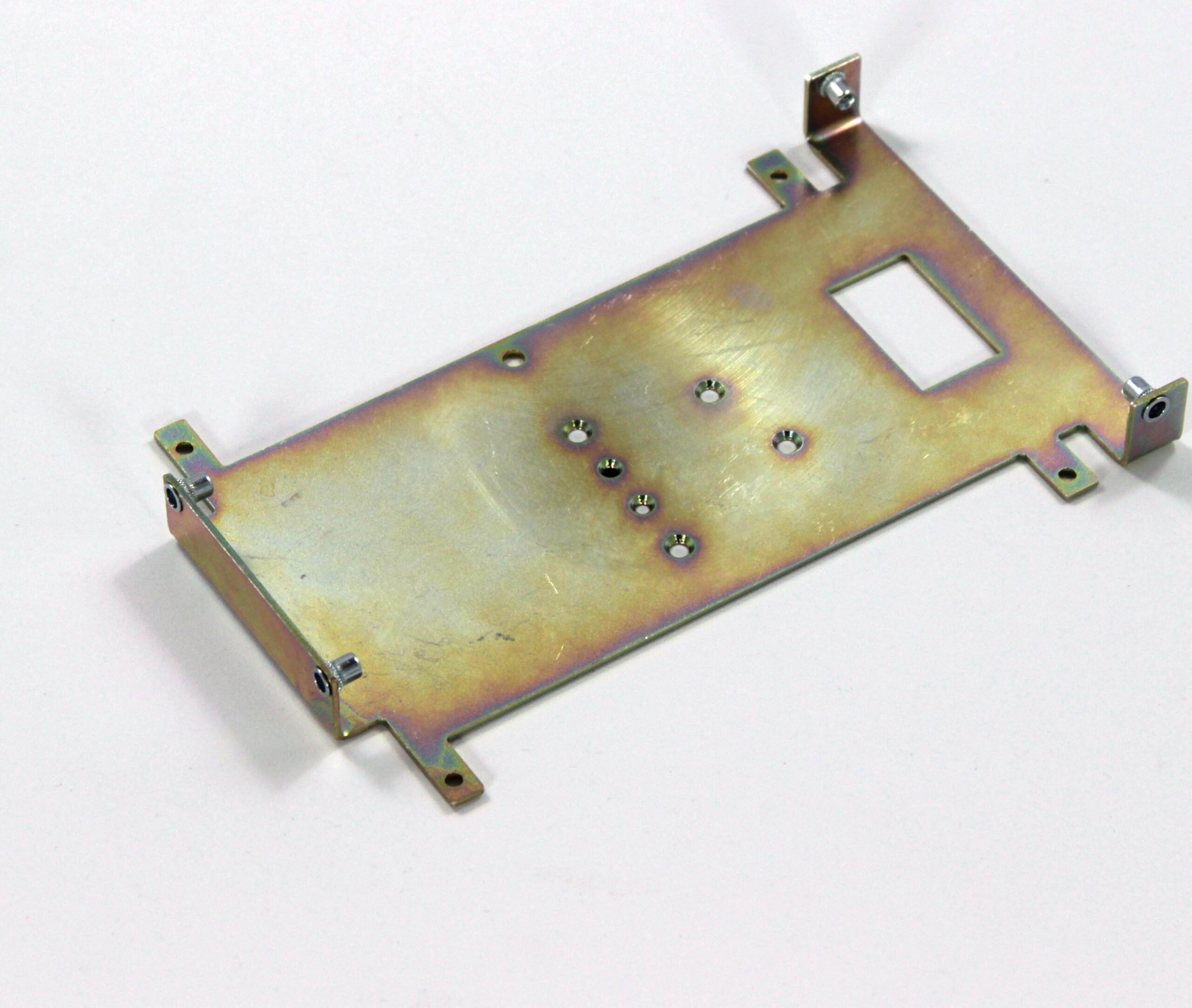 Конструкция включает центральную монтажную площадку с рядом отверстий Ø5 мм для крепления оборудования и два боковых крыла с гибкой под 90° для жёсткой фиксации на вертикальных поверхностях. Угловые вырезы и дополнительные отверстия обеспечивают точную посадку и вентиляцию, золотисто-коричневое покрытие придаёт повышенную устойчивость к внешним воздействиям.
