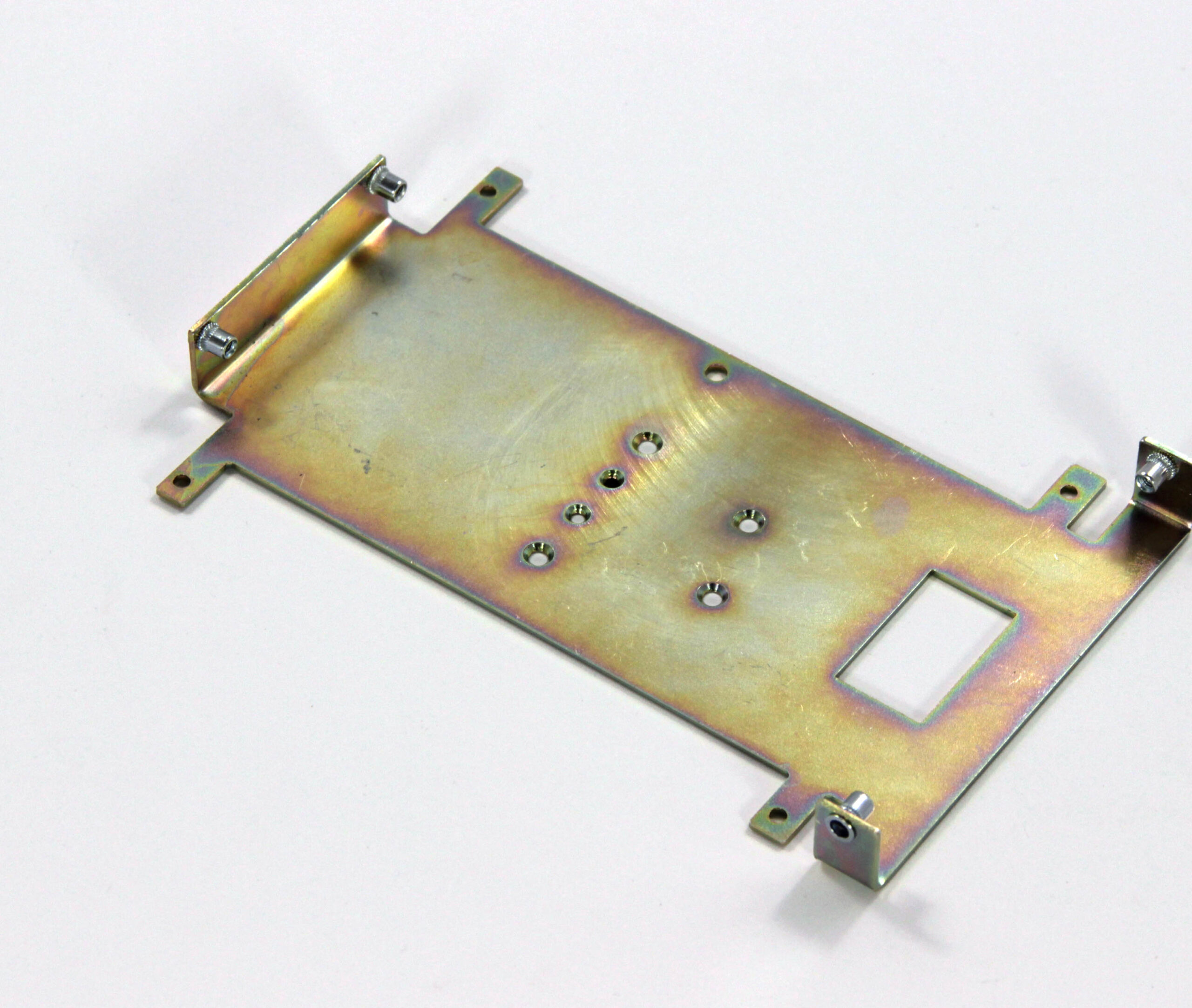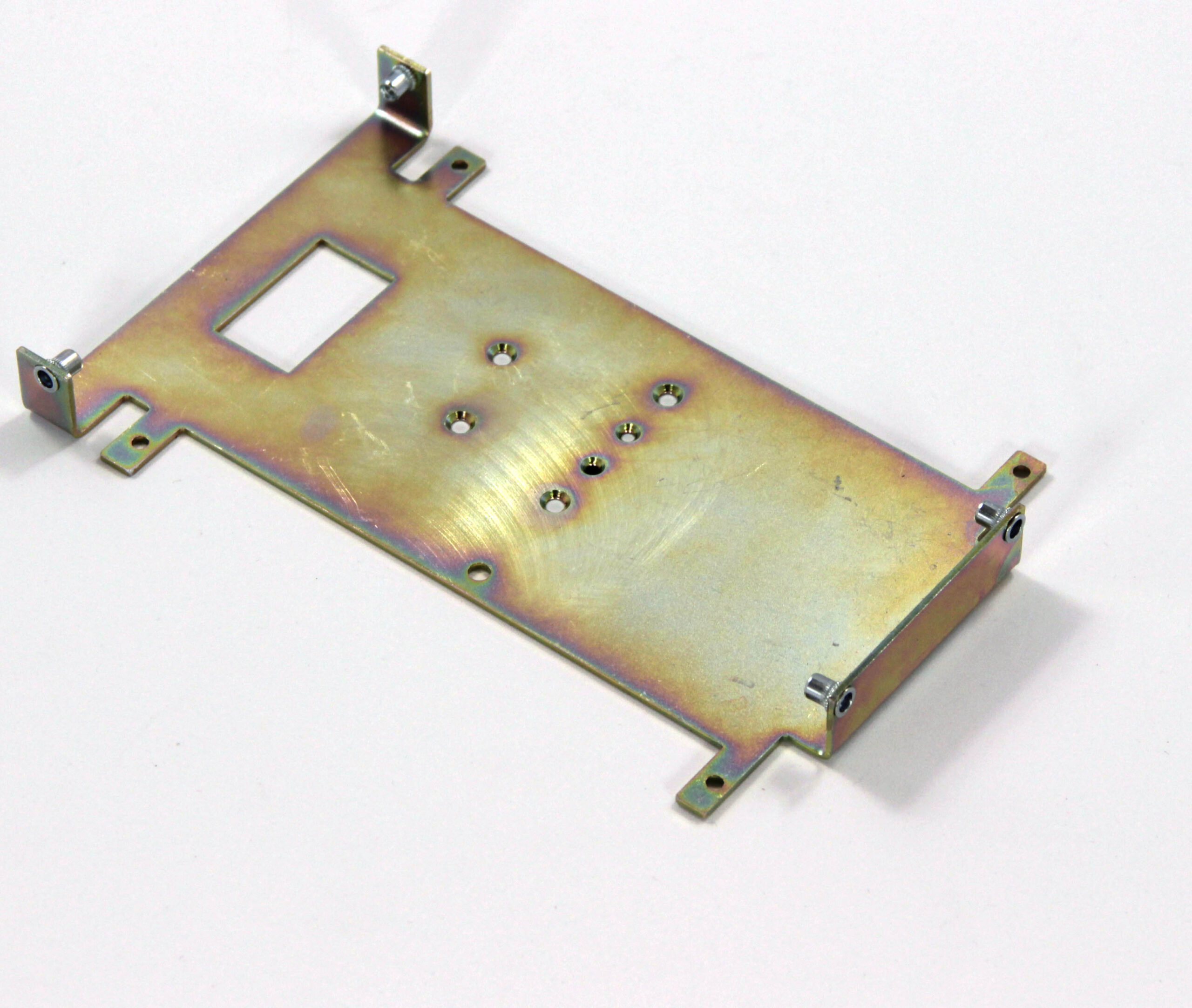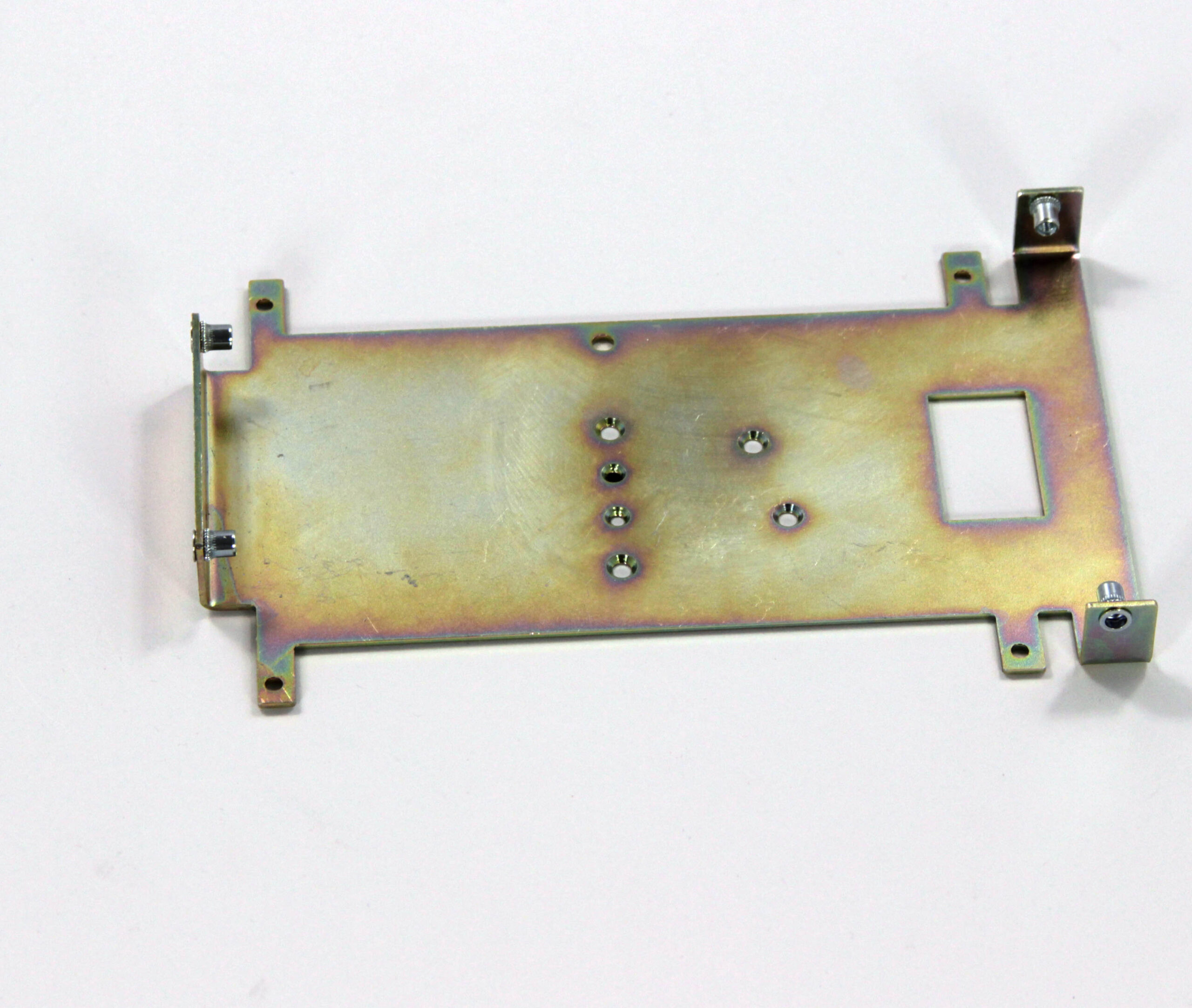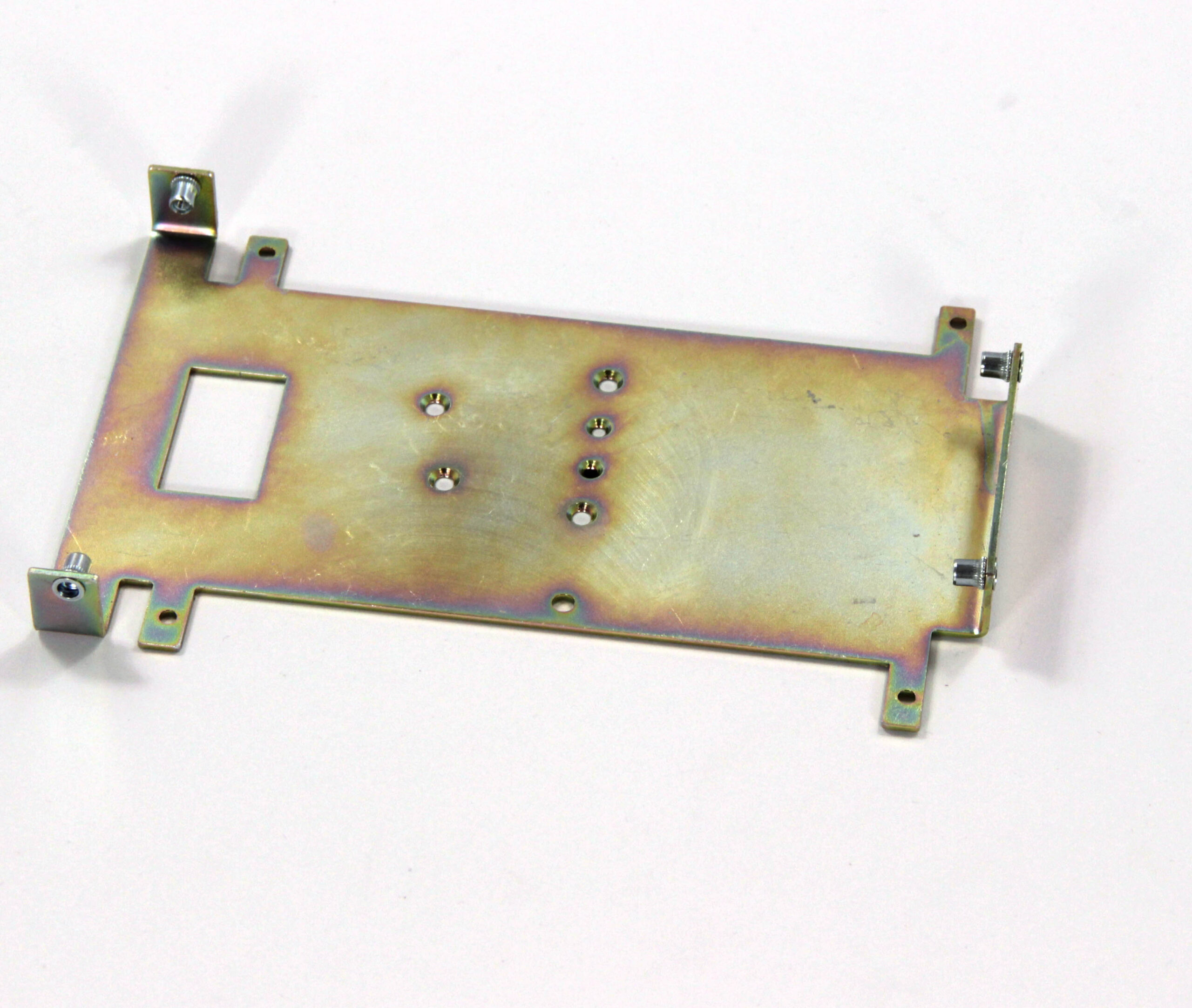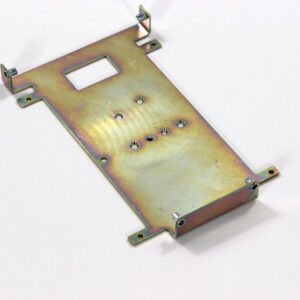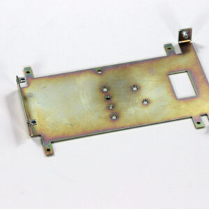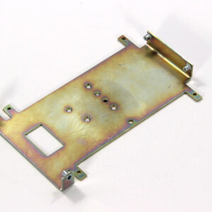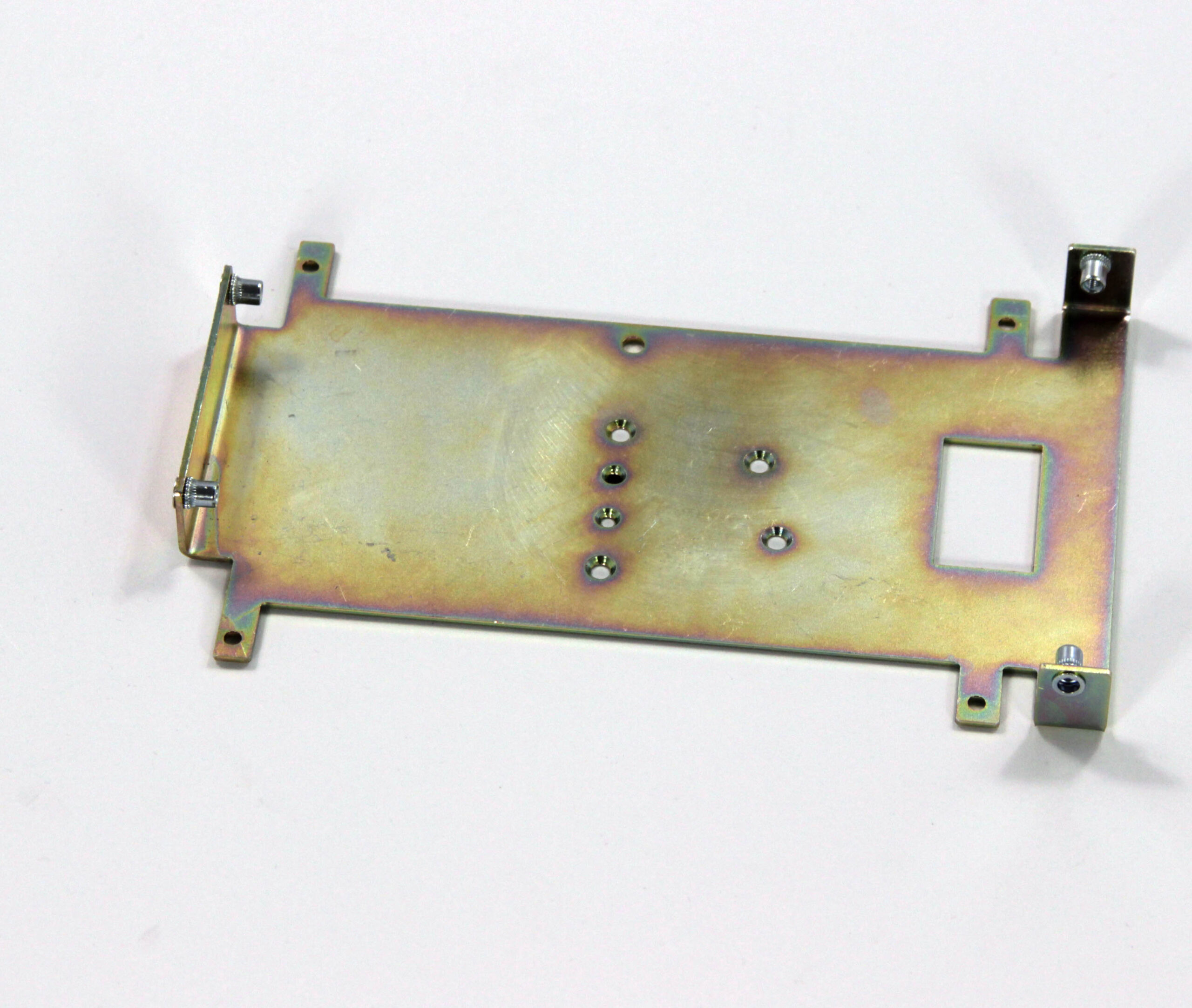 Конструкция включает центральную монтажную площадку с рядом отверстий Ø5 мм для крепления оборудования и два боковых крыла с гибкой под 90° для жёсткой фиксации на вертикальных поверхностях. Угловые вырезы и дополнительные отверстия обеспечивают точную посадку и вентиляцию, золотисто-коричневое покрытие придаёт повышенную устойчивость к внешним воздействиям.