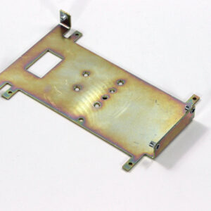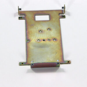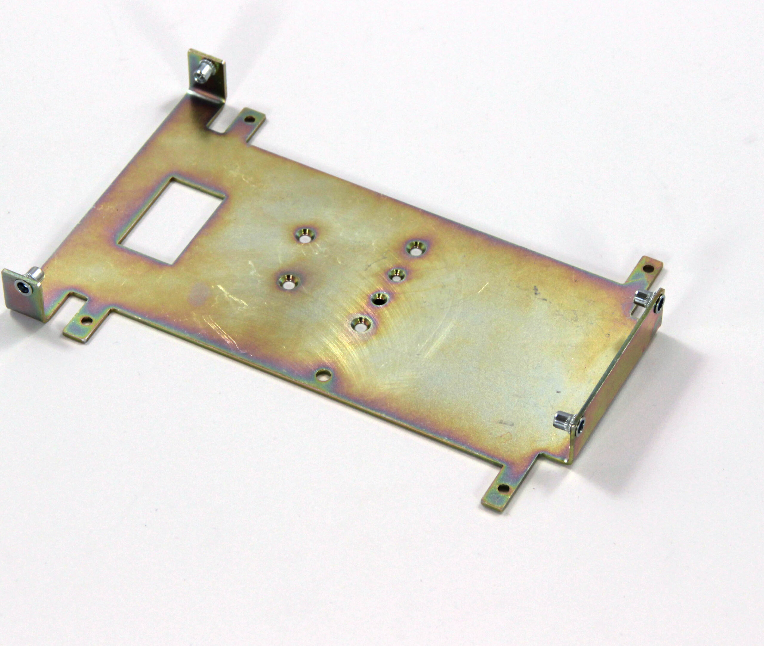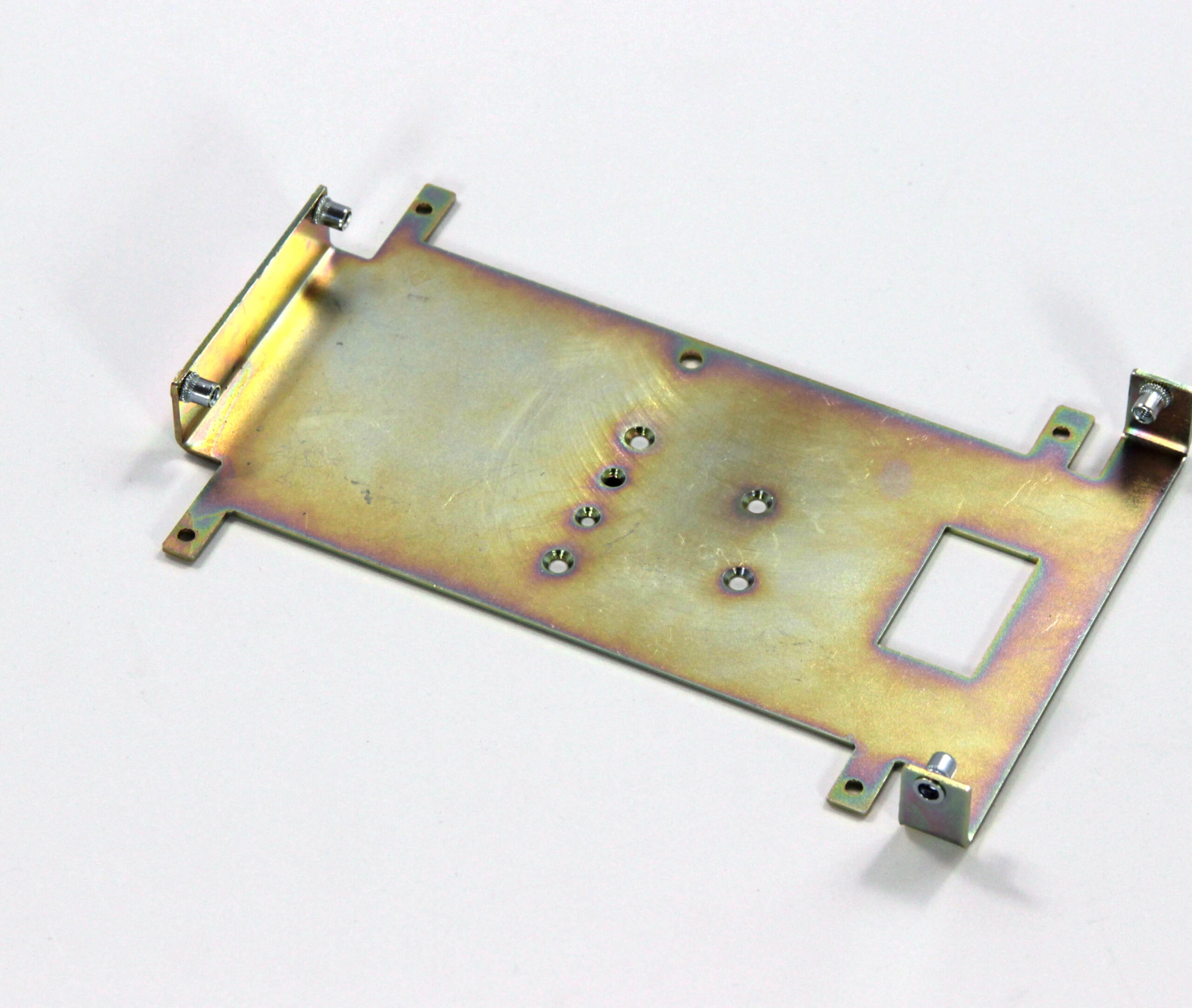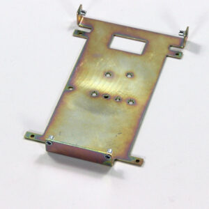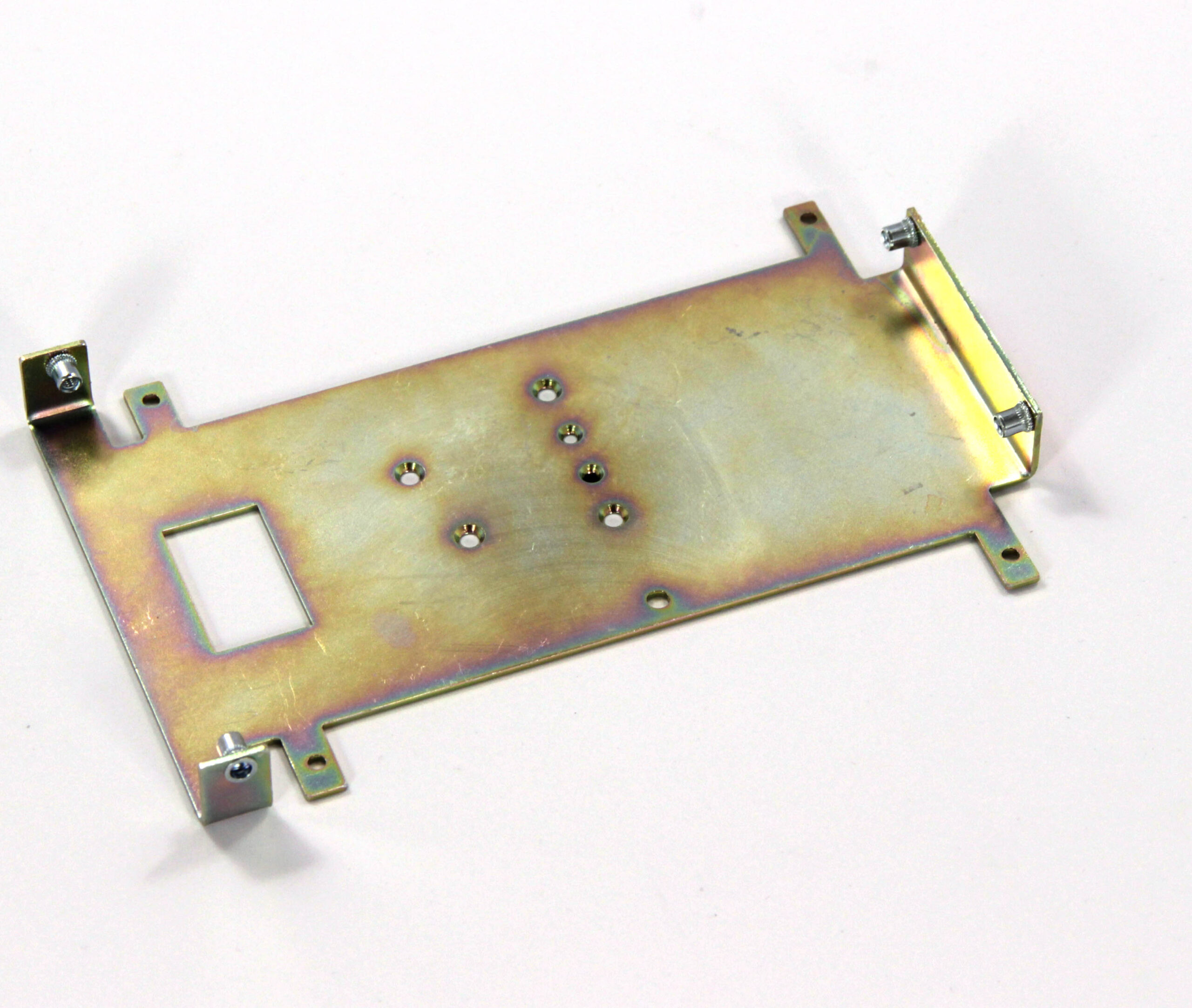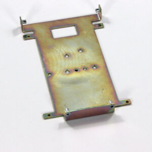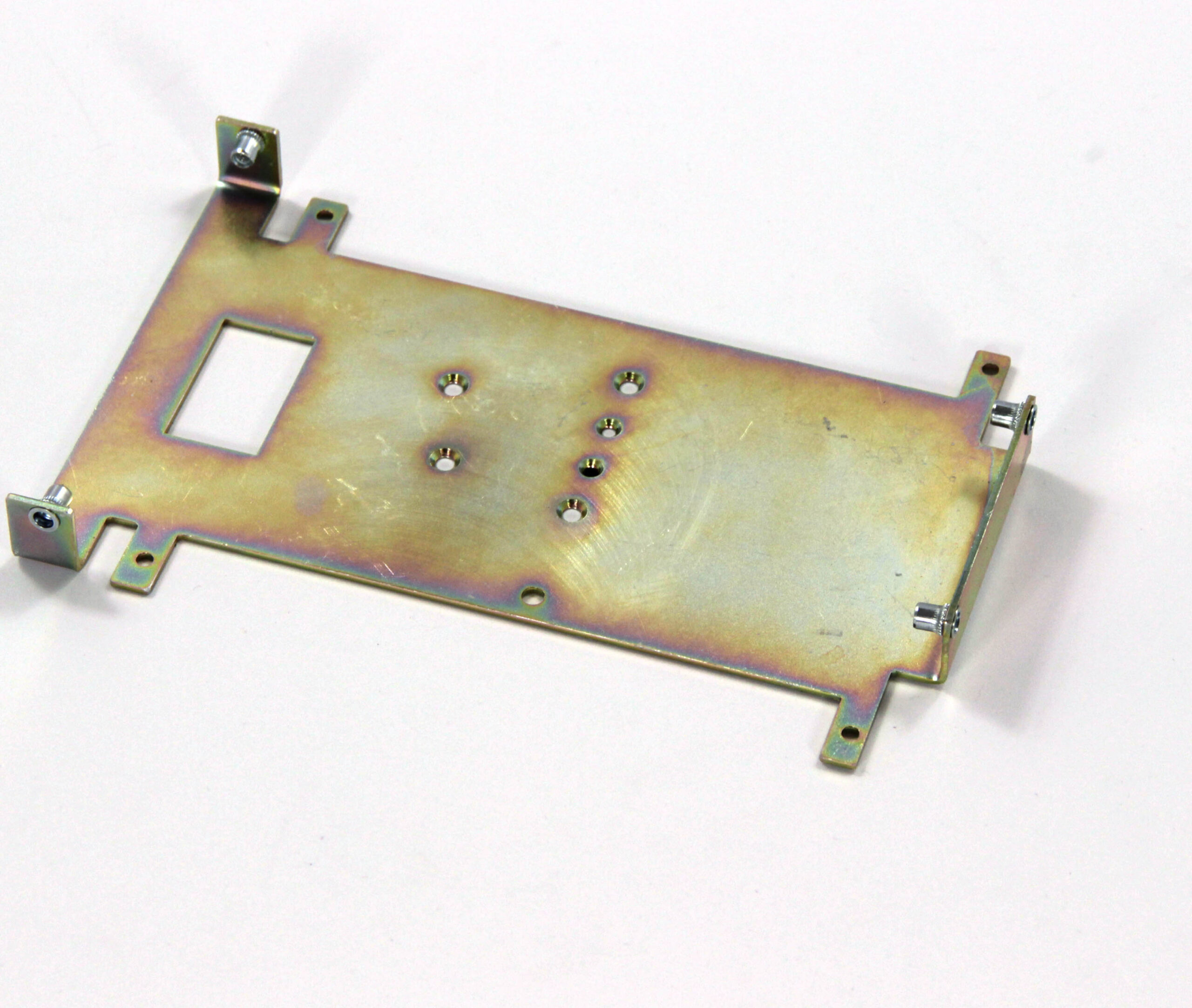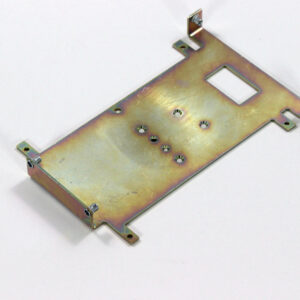 Конструкция включает центральную монтажную площадку с рядом отверстий Ø5 мм для крепления оборудования и два боковых крыла с гибкой под 90° для жёсткой фиксации на вертикальных поверхностях. Угловые вырезы и дополнительные отверстия обеспечивают точную посадку и вентиляцию, золотисто-коричневое покрытие придаёт повышенную устойчивость к внешним воздействиям.