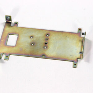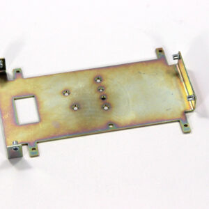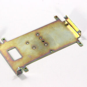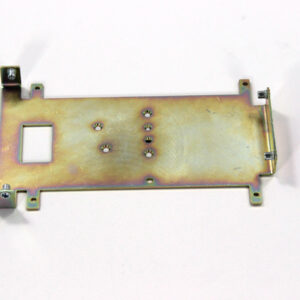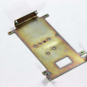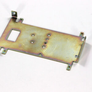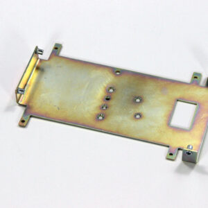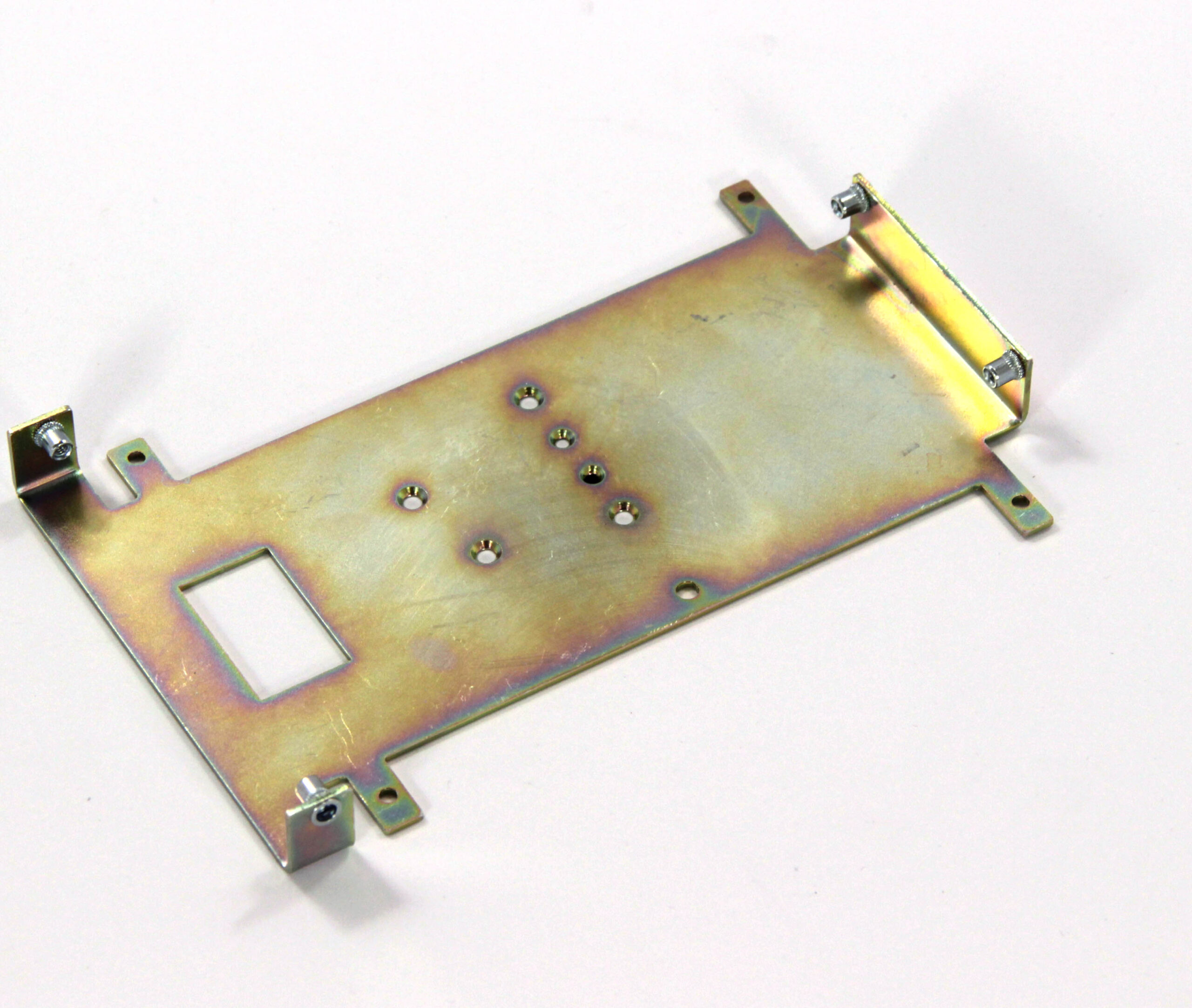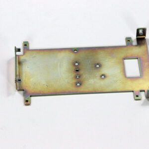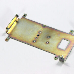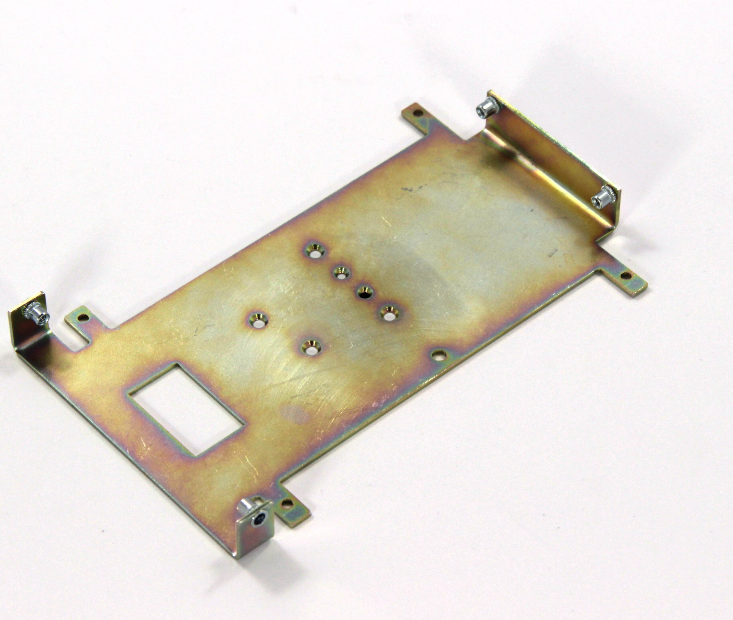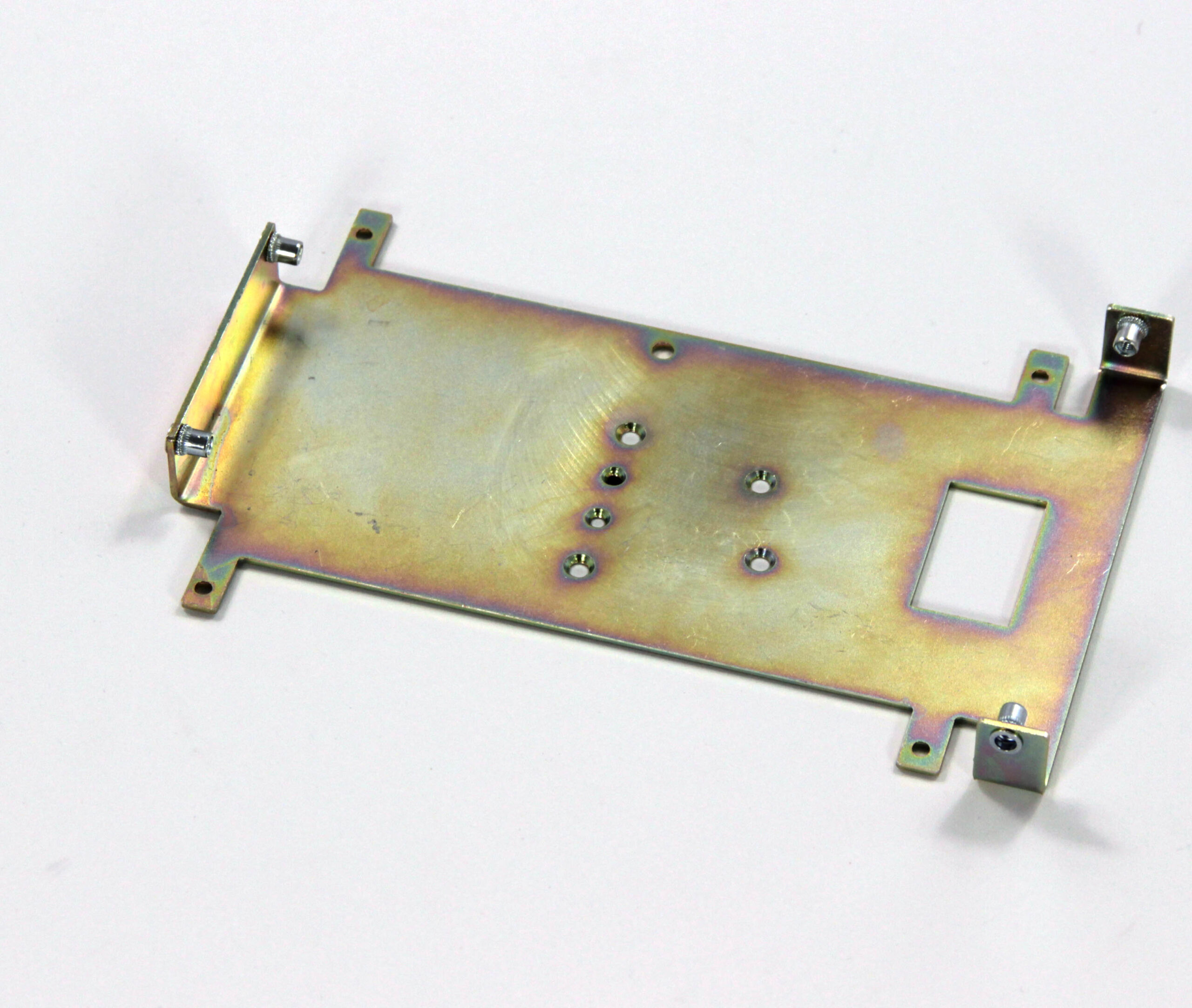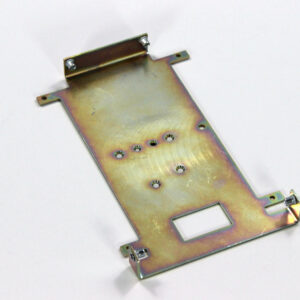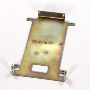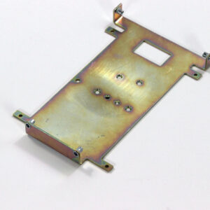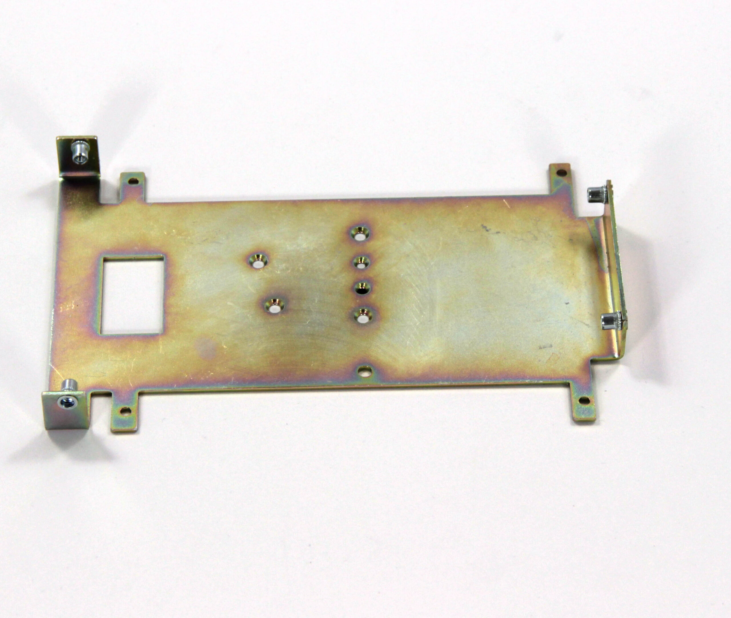 Конструкция включает центральную монтажную площадку с рядом отверстий Ø5 мм для крепления оборудования и два боковых крыла с гибкой под 90° для жёсткой фиксации на вертикальных поверхностях. Угловые вырезы и дополнительные отверстия обеспечивают точную посадку и вентиляцию, золотисто-коричневое покрытие придаёт повышенную устойчивость к внешним воздействиям.